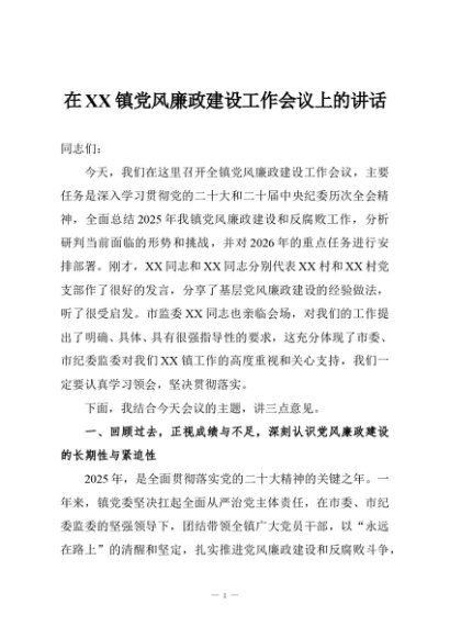 / 【七哥公文】2025年:在XX镇党风廉政建设工作会议上的讲话+更多免费公文+VX:QiGeGongWen2024