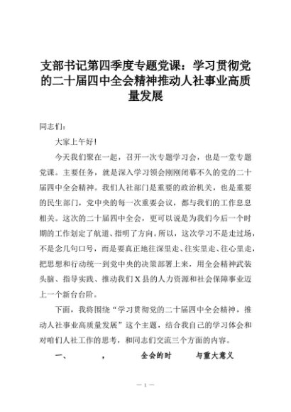 【七哥公文】2025年:支部书记第四季度专题党课:学习贯彻党的二十届四中全会精神推动人社事业高质量发展+更多免费公文+VX:QiGeGongWen2024