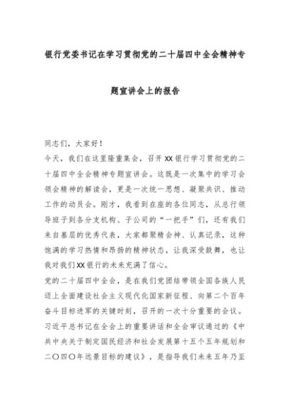 【七哥公文】2025年:银行党委书记在学习贯彻党的二十届四中全会精神专题宣讲会上的报告_副本+更多免费公文+VX:QiGeGongWen2024