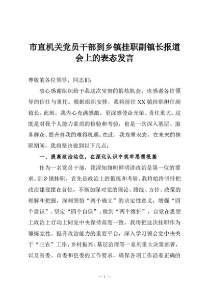【七哥公文】2025年:市直机关党员干部到乡镇挂职副镇长报道会上的表态发言+更多免费公文+VX:QiGeGongWen2024