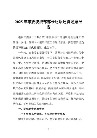/ 【七哥公文】2025年:2025年市委统战部部长述职述责述廉报告+更多免费公文+VX:QiGeGongWen2024