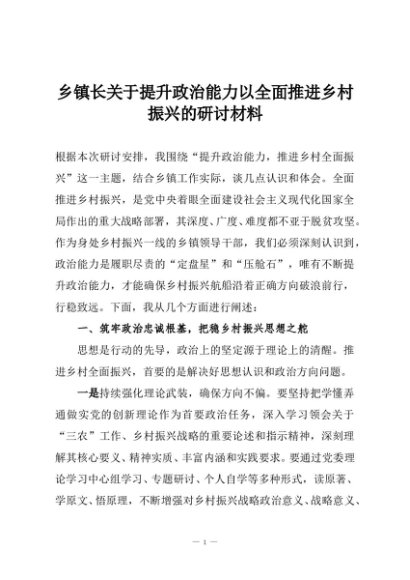 【七哥公文】2025年:乡镇长关于提升政治能力以全面推进乡村振兴的研讨材料+更多免费公文+VX:QiGeGongWen2024