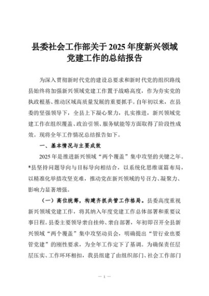 【七哥公文】2025年:县委社会工作部关于2025年度新兴领域党建工作的总结报告+更多免费公文+VX:QiGeGongWen2024
