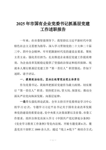 【七哥公文】2025年:2025年市国有企业党委书记抓基层党建工作述职报告+更多免费公文+VX:QiGeGongWen2024