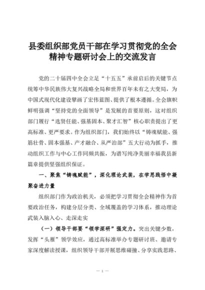 【七哥公文】2025年:县委组织部党员干部在学习贯彻党的全会精神专题研讨会上的交流发言+更多免费公文+VX:QiGeGongWen2024