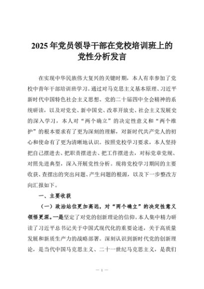 【七哥公文】2025年:2025年党员领导干部在党校培训班上的党性分析发言+更多免费公文+VX:QiGeGongWen2024