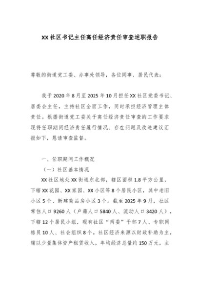 / 【七哥公文】2025年:XX社区书记主任离任经济责任审查述职报告_副本+更多免费公文+VX:QiGeGongWen2024