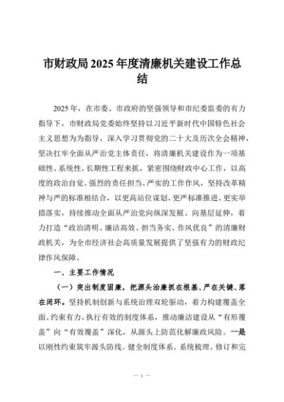 / 【七哥公文】2025年:市财政局2025年度清廉机关建设工作总结+更多免费公文+VX:QiGeGongWen2024