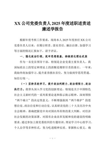/ 【七哥公文】2025年:XX公司党委负责人2025年度述职述责述廉述学报告+更多免费公文+VX:QiGeGongWen2024