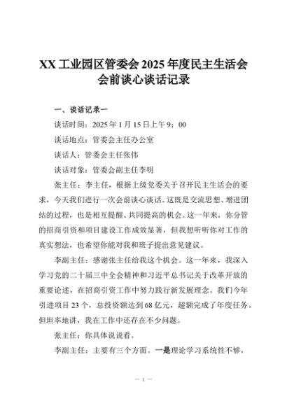 【七哥公文】2025年:XX工业园区管委会2025年度民主生活会会前谈心谈话记录+更多免费公文+VX:QiGeGongWen2024