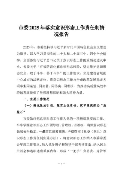 / 【七哥公文】2025年:市委2025年落实意识形态工作责任制情况报告+更多免费公文+VX:QiGeGongWen2024