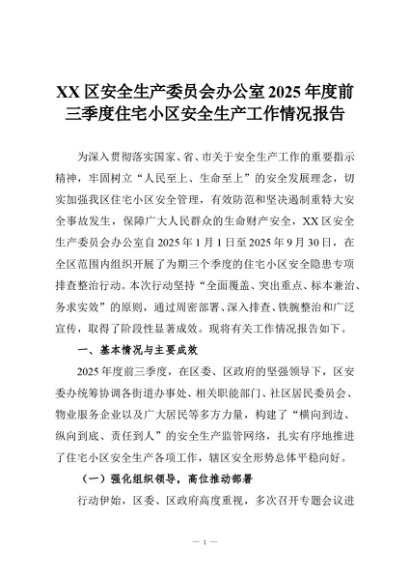 【七哥公文】2025年:XX区安全生产委员会办公室2025年度前三季度住宅小区安全生产工作情况报告+更多免费公文+VX:QiGeGongWen2024