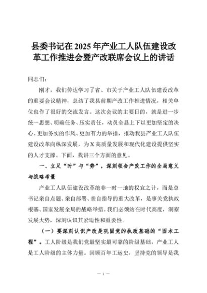 【七哥公文】2025年:县委书记在2025年产业工人队伍建设改革工作推进会暨产改联席会议上的讲话+更多免费公文+VX:QiGeGongWen2024