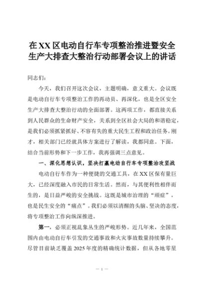【七哥公文】2025年:在XX区电动自行车专项整治推进暨安全生产大排查大整治行动部署会议上的讲话+更多免费公文+VX:QiGeGongWen2024