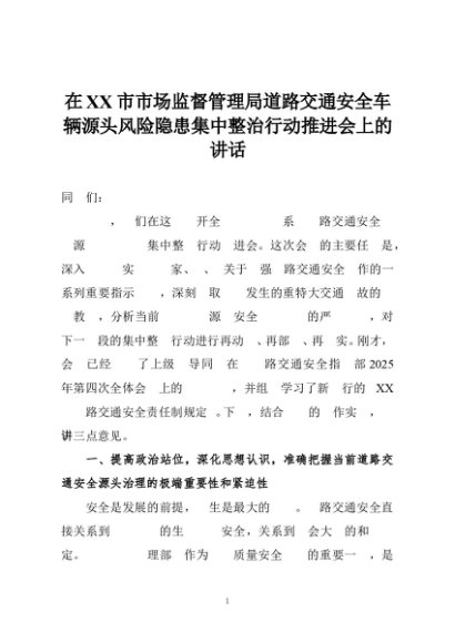 【七哥公文】2025年:在XX市市场监督管理局道路交通安全车辆源头风险隐患集中整治行动推进会上的讲话+更多免费公文+VX:QiGeGongWen2024