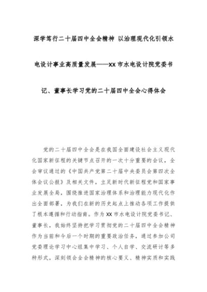 【七哥公文】2025年:深学笃行二十届四中全会精神 以治理现代化引领水电设计事业高质量发展——XX市水电设计院党委书记、董事长学习党的二十届四中全会心得体会_副本+更多免费公文+VX:QiGeGongWen2024