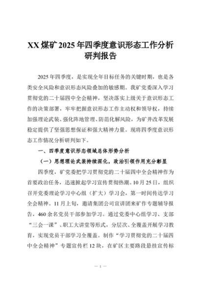 / 【七哥公文】2025年:XX煤矿2025年四季度意识形态工作分析研判报告+更多免费公文+VX:QiGeGongWen2024