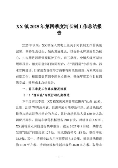 / 【七哥公文】2025年:XX镇2025年第四季度河长制工作总结报告+更多免费公文+VX:QiGeGongWen2024