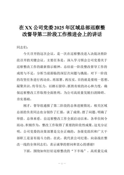 【七哥公文】2025年:在XX公司党委2025年区域总部巡察整改督导第二阶段工作推进会上的讲话+更多免费公文+VX:QiGeGongWen2024