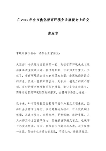 【七哥公文】2025年:在2025年全市优化营商环境企业座谈会上的交流发言_副本+更多免费公文+VX:QiGeGongWen2024