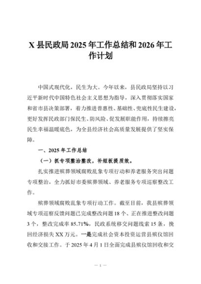 / 【七哥公文】2025年:X县民政局2025年工作总结和2026年工作计划+更多免费公文+VX:QiGeGongWen2024
