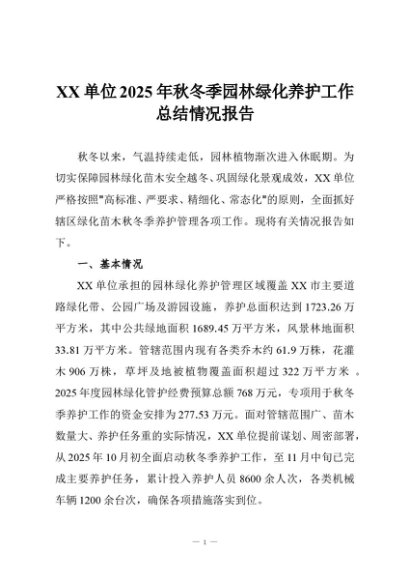 【七哥公文】2025年:XX单位2025年秋冬季园林绿化养护工作总结情况报告+更多免费公文+VX:QiGeGongWen2024
