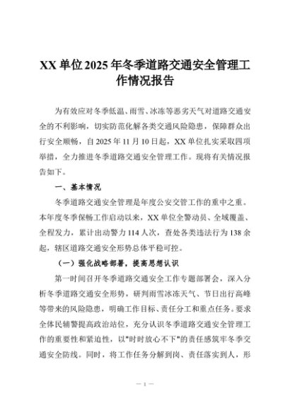 / 【七哥公文】2025年:XX单位2025年冬季道路交通安全管理工作情况报告+更多免费公文+VX:QiGeGongWen2024