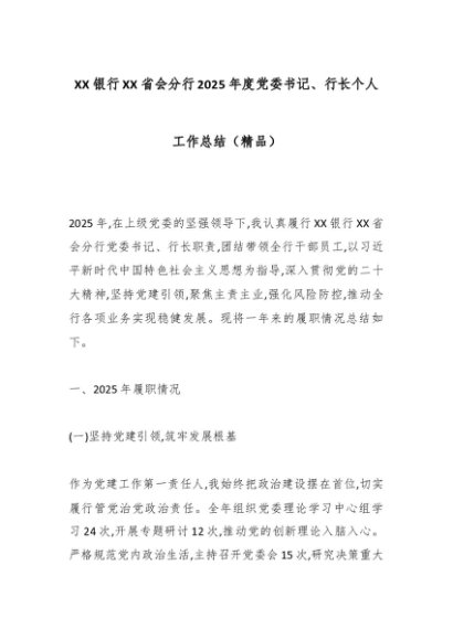 【七哥公文】2025年:XX银行XX省会分行2025年度党委书记、行长个人工作总结(精品)_副本+更多免费公文+VX:QiGeGongWen2024