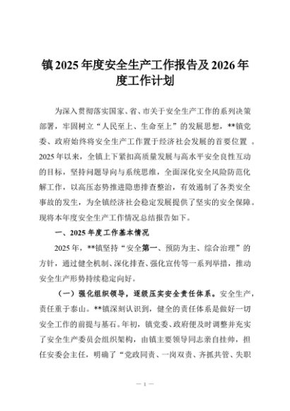 【七哥公文】2025年:镇2025年度安全生产工作报告及2026年度工作计划+更多免费公文+VX:QiGeGongWen2024