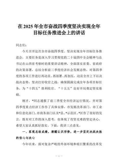 【七哥公文】2025年:在2025年全市奋战四季度坚决实现全年目标任务推进会上的讲话+更多免费公文+VX:QiGeGongWen2024
