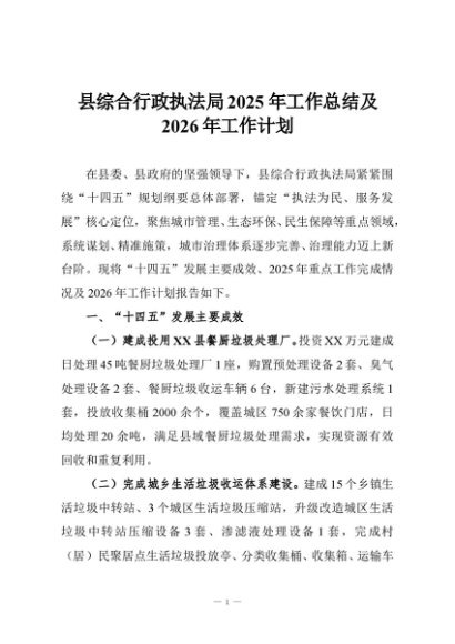 【七哥公文】2025年:县综合行政执法局2025年工作总结及2026年工作计划+更多免费公文+VX:QiGeGongWen2024
