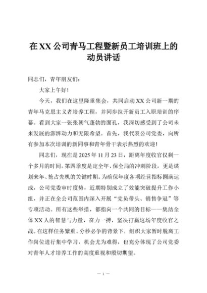 / 【七哥公文】2025年:在XX公司青马工程暨新员工培训班上的动员讲话+更多免费公文+VX:QiGeGongWen2024