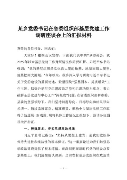 【七哥公文】2025年:某乡党委书记在省委组织部基层党建工作调研座谈会上的汇报材料+更多免费公文+VX:QiGeGongWen2024