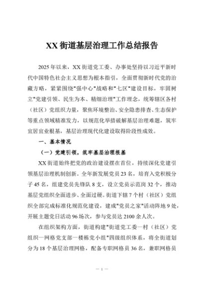 / 【七哥公文】2025年:XX街道基层治理工作总结报告+更多免费公文+VX:QiGeGongWen2024