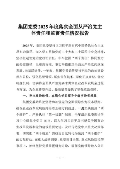 【七哥公文】2025年:集团党委2025年度落实全面从严治党主体责任和监督责任情况报告+更多免费公文+VX:QiGeGongWen2024