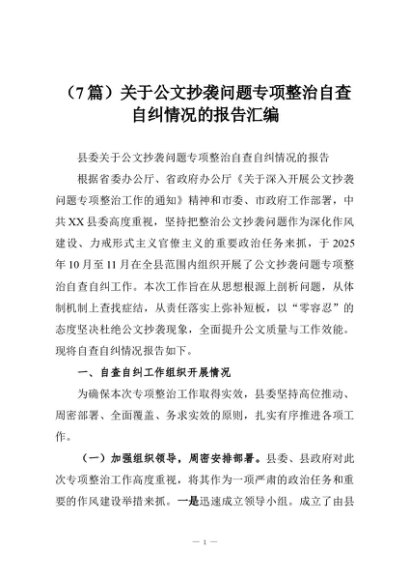 【七哥公文】2025年:(7篇)关于公文抄袭问题专项整治自查自纠情况的报告汇编+更多免费公文+VX:QiGeGongWen2024