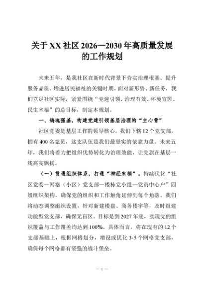 【七哥公文】2025年:关于XX社区2026—2030年高质量发展的工作规划+更多免费公文+VX:QiGeGongWen2024