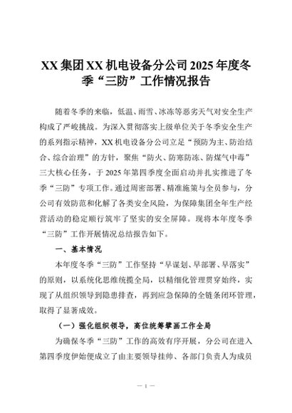 【七哥公文】2025年:XX集团XX机电设备分公司2025年度冬季“三防”工作情况报告+更多免费公文+VX:QiGeGongWen2024
