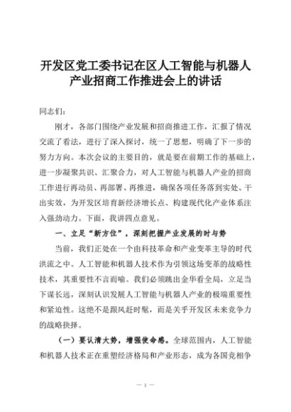 【七哥公文】2025年:开发区党工委书记在区人工智能与机器人产业招商工作推进会上的讲话+更多免费公文+VX:QiGeGongWen2024