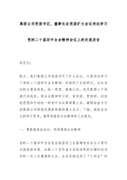 【七哥公文】2025年:集团公司党委书记、董事长在党委扩大会议传达学习党的二十届四中全会精神会议上的交流发言_副本+更多免费公文+VX:QiGeGongWen2024
