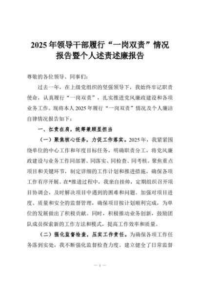 【七哥公文】2025年:2025年领导干部履行“一岗双责”情况报告暨个人述责述廉报告+更多免费公文+VX:QiGeGongWen2024