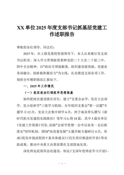 / 【七哥公文】2025年:XX单位2025年度支部书记抓基层党建工作述职报告+更多免费公文+VX:QiGeGongWen2024
