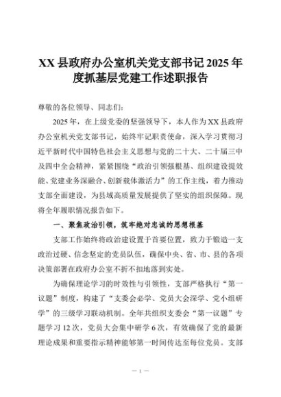 【七哥公文】2025年:XX县政府办公室机关党支部书记2025年度抓基层党建工作述职报告+更多免费公文+VX:QiGeGongWen2024