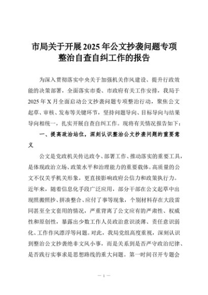 【七哥公文】2025年:市局关于开展2025年公文抄袭问题专项整治自查自纠工作的报告+更多免费公文+VX:QiGeGongWen2024