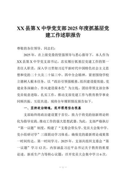 【七哥公文】2025年:XX县第X中学党支部2025年度抓基层党建工作述职报告+更多免费公文+VX:QiGeGongWen2024