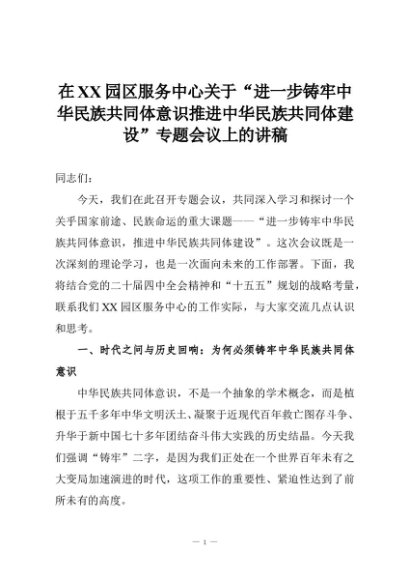 【七哥公文】2025年:在XX园区服务中心关于“进一步铸牢中华民族共同体意识推进中华民族共同体建设”专题会议上的讲稿+更多免费公文+VX:QiGeGongWen2024