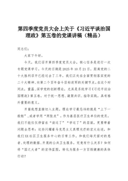 【七哥公文】2025年:第四季度党员大会上关于《习近平谈治国理政》第五卷的党课讲稿(精品)_副本+更多免费公文+VX:QiGeGongWen2024