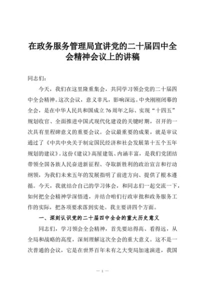 【七哥公文】2025年:在政务服务管理局宣讲党的二十届四中全会精神会议上的讲稿+更多免费公文+VX:QiGeGongWen2024