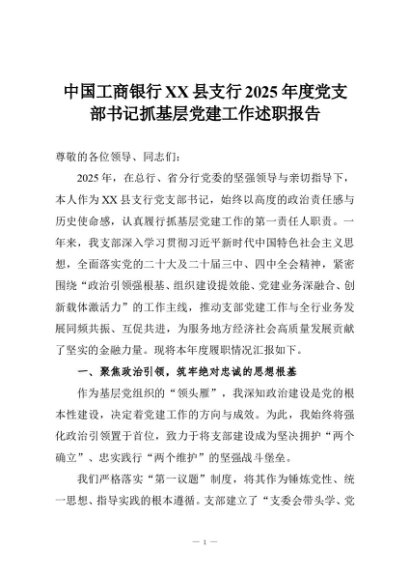 【七哥公文】2025年:中国工商银行XX县支行2025年度党支部书记抓基层党建工作述职报告+更多免费公文+VX:QiGeGongWen2024