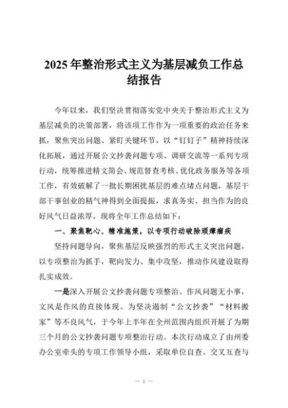 / 【七哥公文】2025年:2025年整治形式主义为基层减负工作总结报告+更多免费公文+VX:QiGeGongWen2024